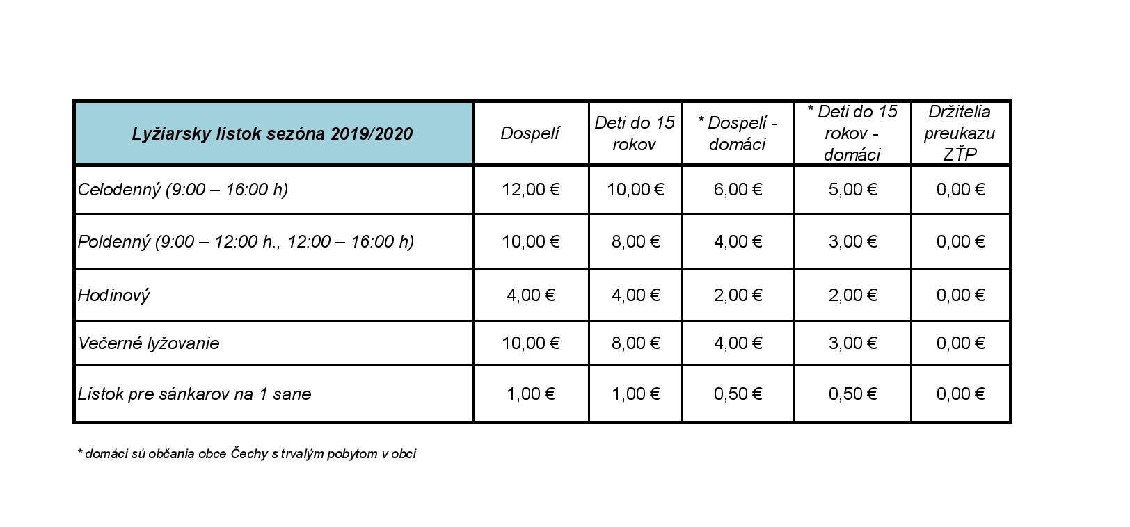 Pozn. v cenníku sú v kategórii domáci obyvatelia s trvalým pobytom v obci Čechy, všetci ostatní sú hostia.